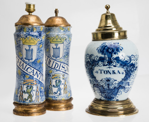 Pareja de albarelos de cerámica de Talavera, España, S. XVIII- S. XIX. Con decoración esponjada del escudo de San Lorenzo del Escorial y cartelas en diagonal con el nombre de la medicina. Montados como lámparas.