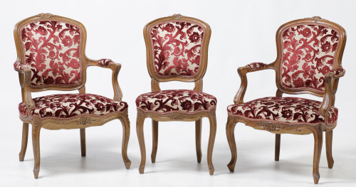 Pareja de butacas y una silla de estilo Luis XV, S. XX. De haya tallada con remate de flores en el respaldo.