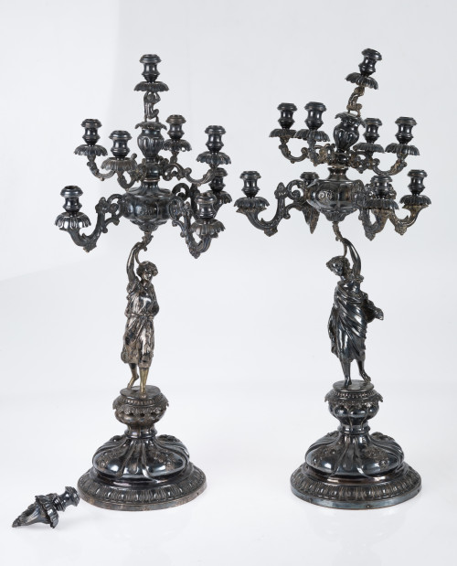Pareja de candelabros de plata con marcas del platero José Casas y marcador B y R, Barcelona, ffs.S.XIX - pps.S.XX.