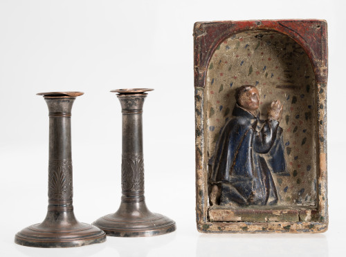 Pareja de candeleros en cobre plateado, con decoración de palmetas al gusto Imperio. S.XIX. Alguna falta.