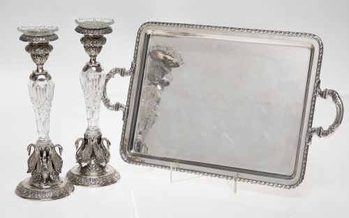 Pareja de candeleros de plata española ley 916 y cristal tallado, S. XX.