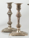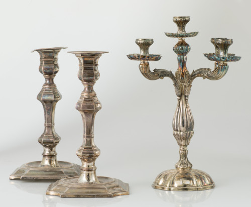 Pareja de candeleros facetados de plata española contrastada, ley 916. Con contrapeso. Abolladuras.