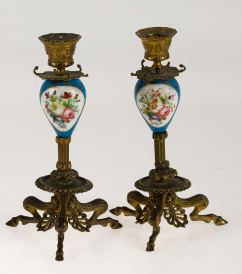 Pareja de candeleros porcelana y metal.