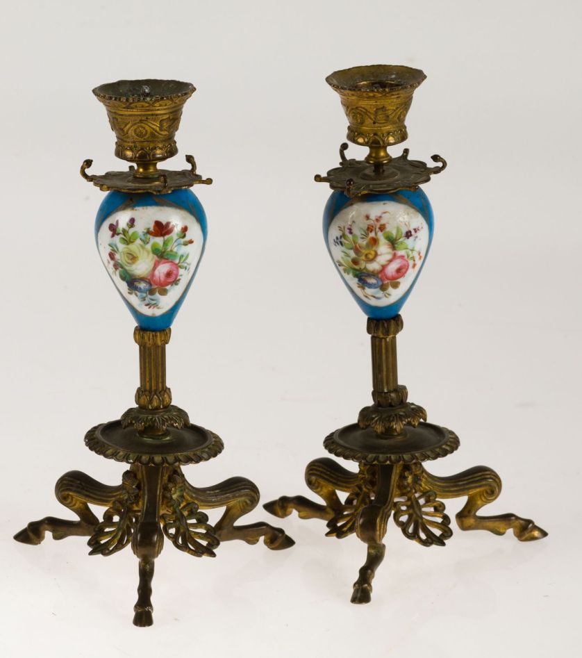 Pareja de candeleros en metal dorado y porcelana vidriada y policromada, al estilo francés. Necesitan repaso. Altura: 22 cm