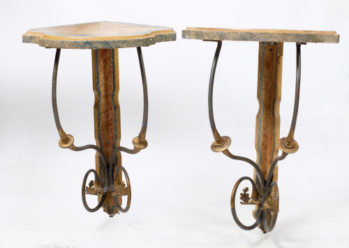 De madera policromada simulando mármol y patas de hierro parcialmente dorado en forma de volutas. Faltas. (Una pata desencolada)