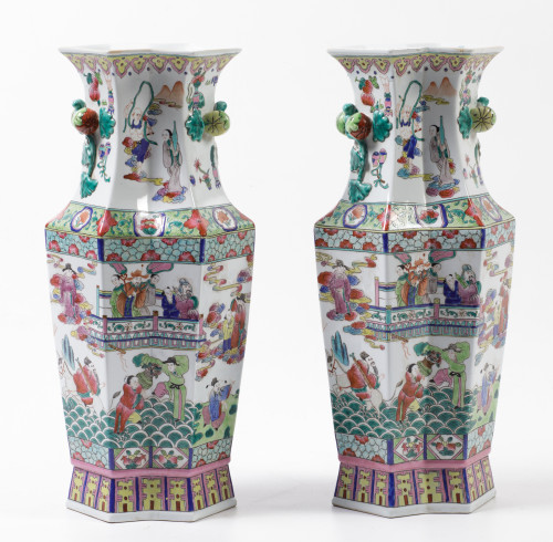 Pareja de jarrones, Familia Rosa, Cantón, S. XX. De perfil doble con decoración de escenas cortesanas y frutos aplicados en los laterales.