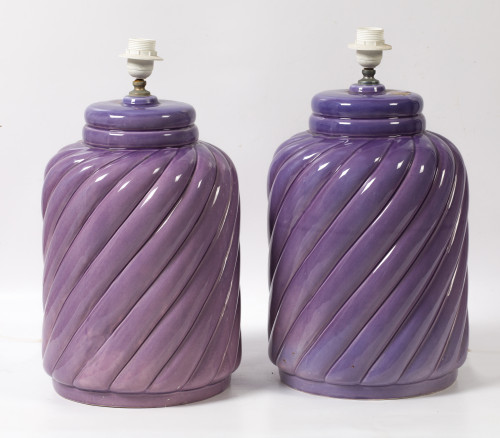 Pareja de lámparas de escayola, manufactura Bondia, Manises, S. XX. Con cuerpo entorchado y esmaltadas en color malva. Un casquillo suelto.