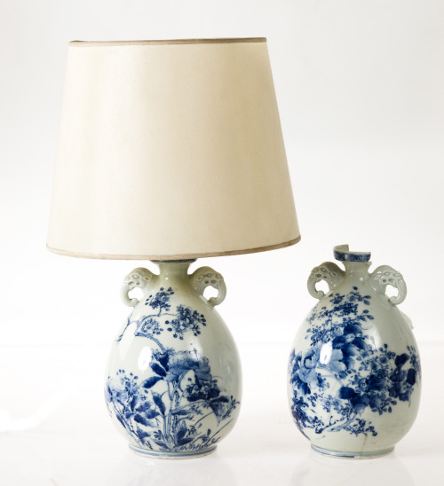 Pareja de lámparas de mesa de porcelana esmaltada y vidriada, China, ffs. S. XIX- pps. S. XX. Con decoración floral en color azul cobalto y asas rematadas por cabezas de animales. Faltas. Presentan restauraciones.