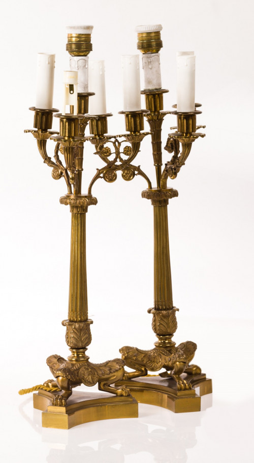 De bronce dorado con pie de trípode en forma de garras y fuste acanalado.