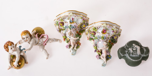 Pareja de ménsulas en porcelana, al estilo alemán, vidriada, policromada y sobredorada, con figuras de amorcillos en relieve entre rocalla y motivos florales.