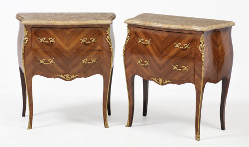 Chapadas en "placage" de palo de rosa con tapa de mármol veteado de tonos ocres y monturas de bronce dorado.