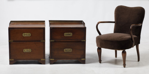 Pareja de mesitas auxiliares de estilo inglés, España, med. S. XX. De roble y latón dorado.