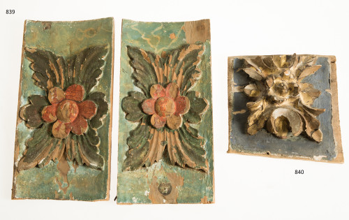 De pino tallado y policromado. Presentan numerosas faltas e importantes repintes.