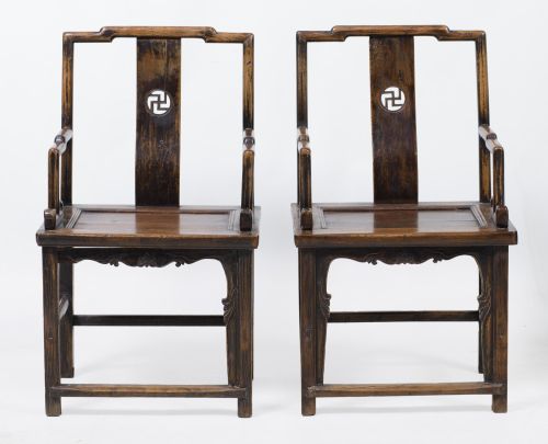De madera tallada con patas y cintura recortadas y respaldo con símbolo "Wan" calado.