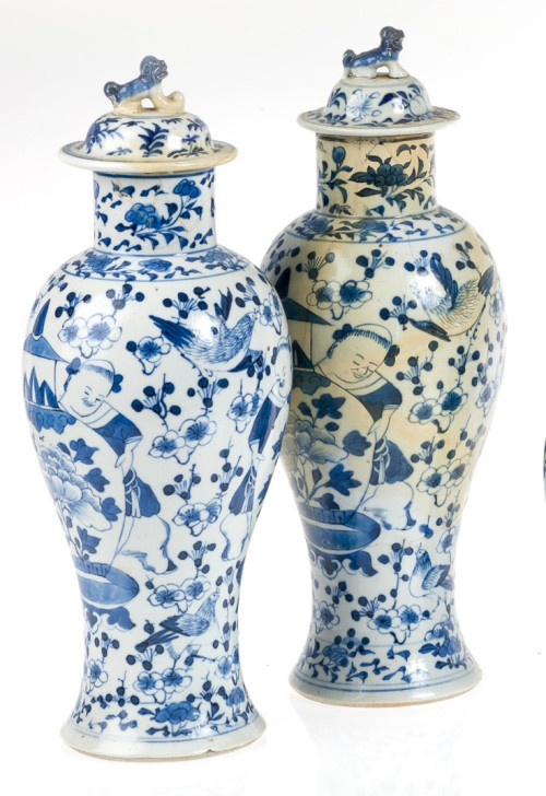 Pareja de tibores en porcelana china vidriada y policromada en azul sobre fondo blanco, con figuras entre objetos preciosos, aves y ramilletes florales. Presentan restauraciones y varias faltas.