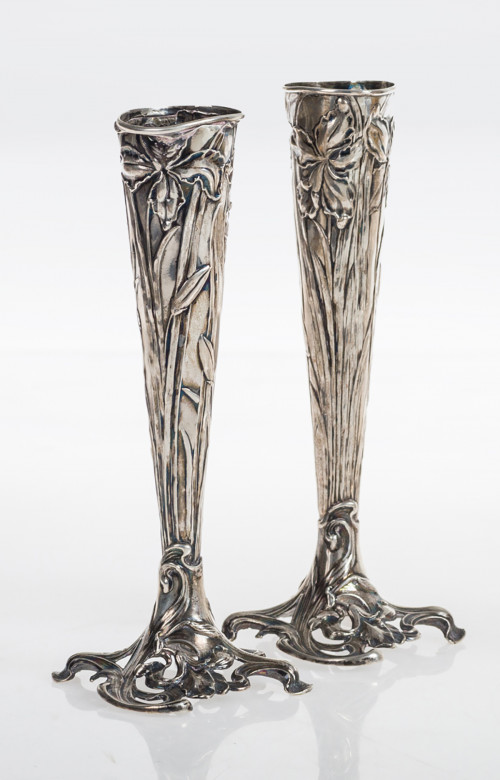 Pareja de violeteros de plata, Alemania, S. XIX. Con decoración de flores y rocallas en la base. Pequeñas abolladuras.