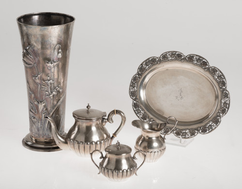Bandejita oval en plata española ley 916. Greca calada de hojas de vid y racimos de uvas.