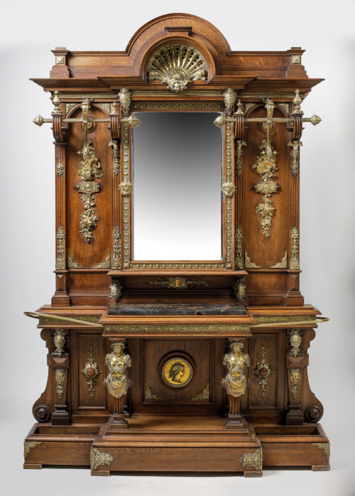 Perchero alfonsino de roble y bronce dorado, España, c. 1900