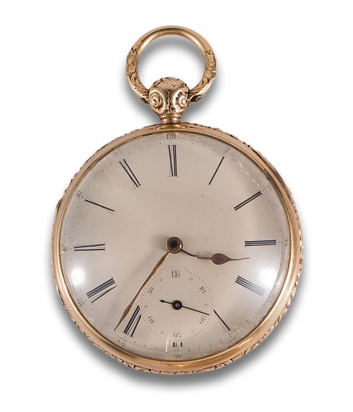 Reloj de bolsillo lepine inglés , movimiento cuerda - llave (no se adjunta), caja de oro amarillo de 18 kt. maquinaria firmada TOWNLEY & GUILLIAM, LIVERPOOL 1404. Diámetro: 46 mm. Esfera beige con numeración romana en negro, agujas en dorado (precisan repaso), segundero a las seis. Peso: 75,60 Gr..