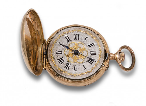 Reloj de bolsillo saboneta de dama, movimiento remontoir. Caja de oro amarillo de 18 kt. Nº 80179. Tapa delantera con decoración floral de diamantes, talla rosa, con guardapolvo. Diámetro: 31 mm. Esfera blanca con decoración guilloche y guirnaldas en oro. Numeración romana en negro, agujas pavonadas, tipo pera. Sin cristal.Peso: 25,60 Gr..