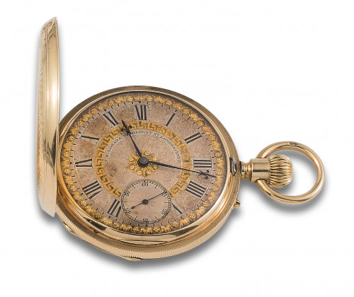 Reloj de bolsillo saboneta LOSADA. Movimiento remontoir. Caja de oro amarillo de 18 kt. Tapas con decoarción guilloche con reserva central con iniciales "A J", tapa guardapolvo. Maquinaria firmada J.R. LOSADA, 105 Regent Streety, London, nº 10142. Esfera en plata con decoración de grecas y guirnaldas en oro, agujas pavonadas flor de lis, ventana segundero a las seis. En estado de marcha