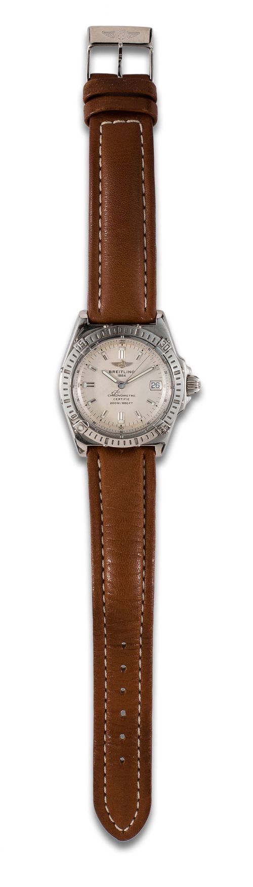 Reloj de pulsera BREITLING, movimiento suizo de cuarzo, caja en acero Nº 396990. Diámetro: 35 mm. Esfera beige con numeración a trazos aplicados, segundero central, ventana calendario a las tres. Pulsera de piel original. Se acompaña de estuche y papeles.