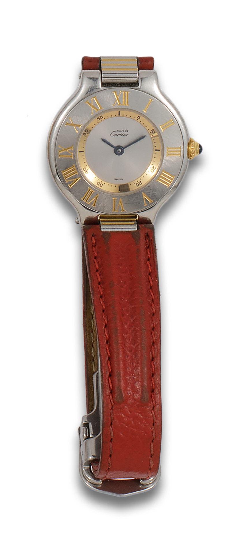 Reloj de pulsera CARTIER 21 MUST, movimiento suizo de cuarzo, caja de acero y detalles en oro amarillo de 18 kt. Nº 1340, PL126470. Diámetro: 29 mm. Esfera plateada con numeración romana, agujas pavonadas. Pulsera de piel roja original, con cierre desplegable.