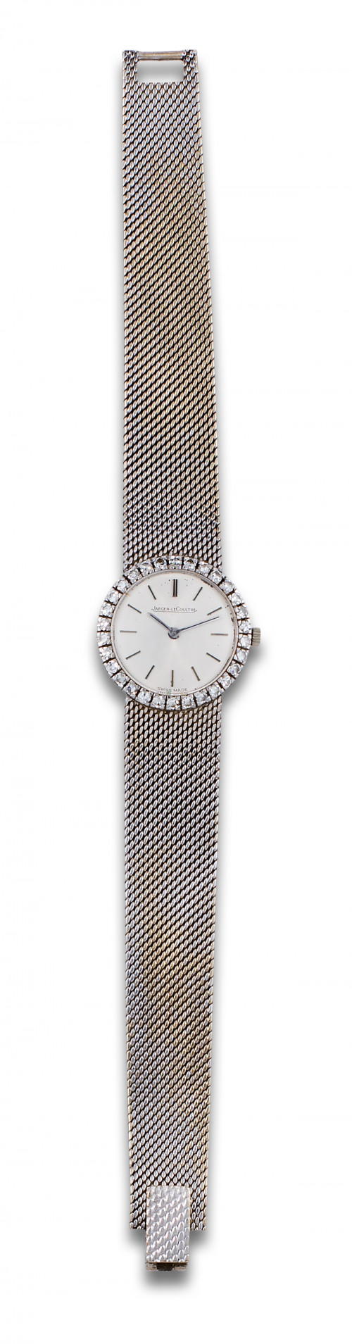 Reloj de pulsera de dama JAEGER LE COULTRE, movimiento mecánico manual, caja y brazalete malla de oro blanco de 18 kt., bisel de diamantes, talla simple. Diámetro: 24 mm. esfera plateada con numeración a trazos aplicados. En estado de marcha. Peso: 50,3 gr