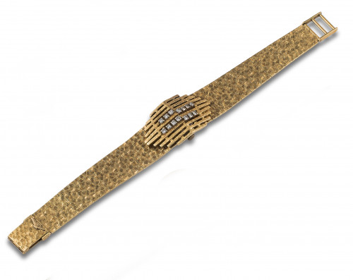 Reloj de pulsera de señora LONGINES, movimiento mecánico manual, caja y brazalete con decoración martelé. Numeración FC 4048. Esfera blanca con decoración a trazos aplicados. Tapa con diamantes, talla brillante. Necesita repaso. Peso: 59,65 Gr..