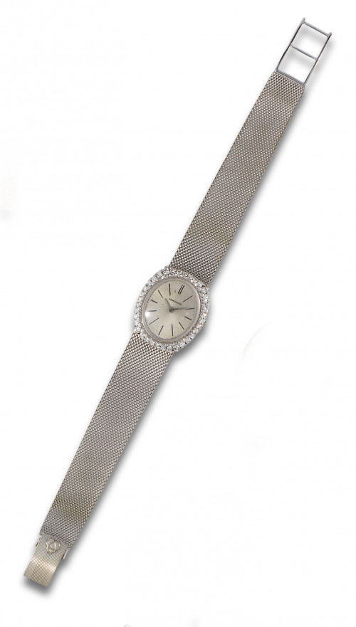 Reloj de pulsera LONGINES de dama, movimiento mecánico manual. Caja y brazalete malla de oro blanco de 18 kt. Bisel de diamantes, talla 8/8. Medidas: 19 x 18 mm. Esfera plateada con numeración baquetonada.Peso: 44,62 Gr..