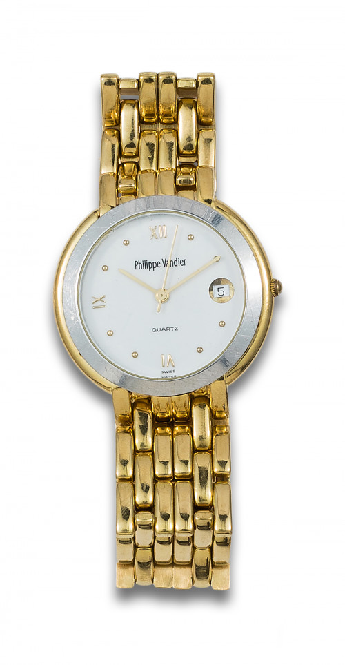 Reloj de pulsera PHILIPPE VANDIER, caja y brazalete de oro amarillo de 18 kt. Nº 1540113. Movimiento suizo de cuarzo. Diámetro 35 mm. Esfera blanca con numeración romana y a puntos aplicados en dorado, al igual que las agujas, segundero central y ventana calendario a la tres. Peso: 70,6 Gr..