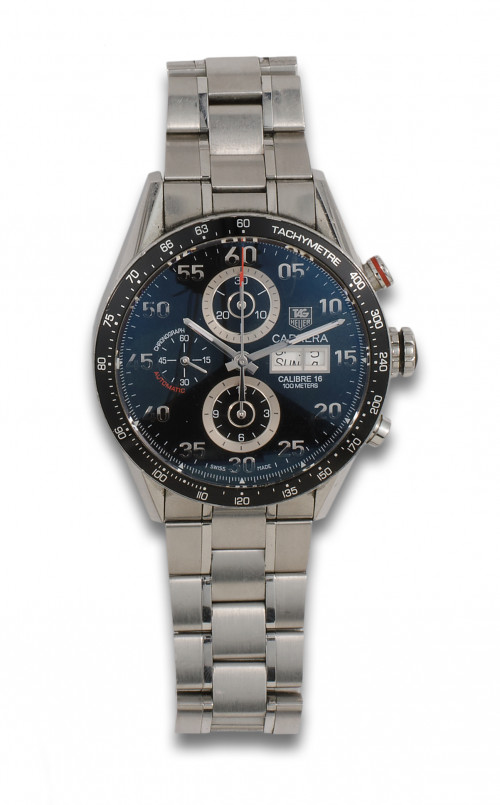 Reloj de pulsera TAG HEUER CARRERA CALIBRE 16, CHRONO, movimiento automático. Caja y brazalete en acero Nº CV2A10, EBG1359. Diámetro: 44. Esfera negra con numeración arábiga en plateado, al igual que las agujas luminiscentes, ventana calendario a las tres, segundero a las nueve y dos ventanas auxiliares para el crono a las doce y seis. En estado de marcha.