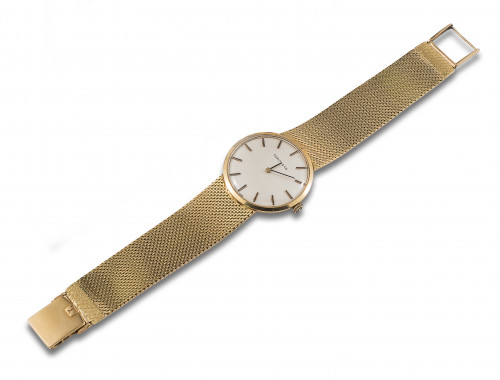 Reloj de pulsera TIFFANY & CO, movimiento caja y brazalete malla de oro amarillo de 18 kt. movimiento mecánico manual, Nº 917.144/3281. Maquinaria firmada TISSOT. Esfera blanca con n umeración baquetonada, agujas pavonadas. En estado de marcha Peso: 59,68 Gr..