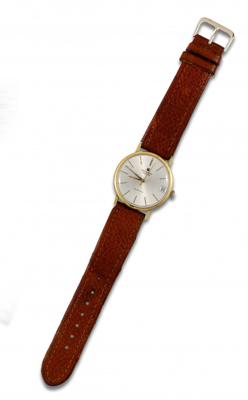Reloj de pulsera UNIVERSAL GENEVE, movimiento automático, caja de oro amarillom de 18 kt. Diámetro: 35 mm. Esfera plateada con numeración a trazos aplicados, segundero central, ventana calendario a las tres. Cristal plexi (necesita repaso). Pulsera de piel marrón. En estado de marcha.