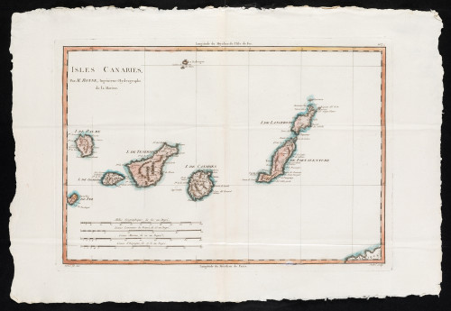 Mapa de las Islas Canarias para el Atlas Encyclopedique. París 1787-1788. Inscrip.: Bonne fil. del.; André sculp. Cuatro escalas.