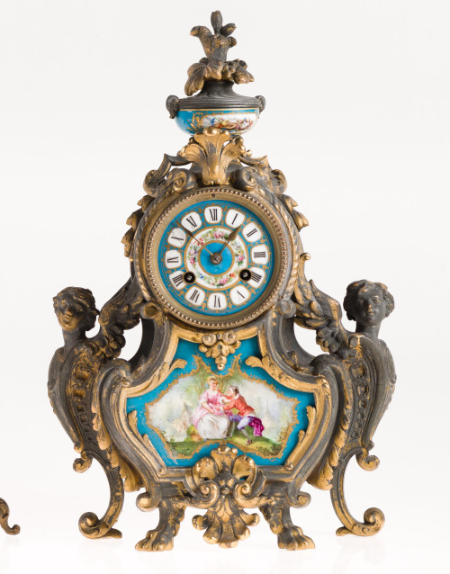 Reloj francés de sobremesa estilo Luis XV, en metal dorado con placas de porcelana vidriada y policromada con escena galante y motivos flroales. Altura: 42 cm.