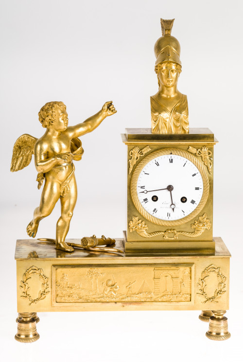 Reloj francés de sobremesa en bronce dorado S.XIX. Basamento con escena en relieve y parte superior con cabeza de Minerva sobre la esfera del reloj, junto a una figura de Cupido en bulto redondo, con sus atributos.
