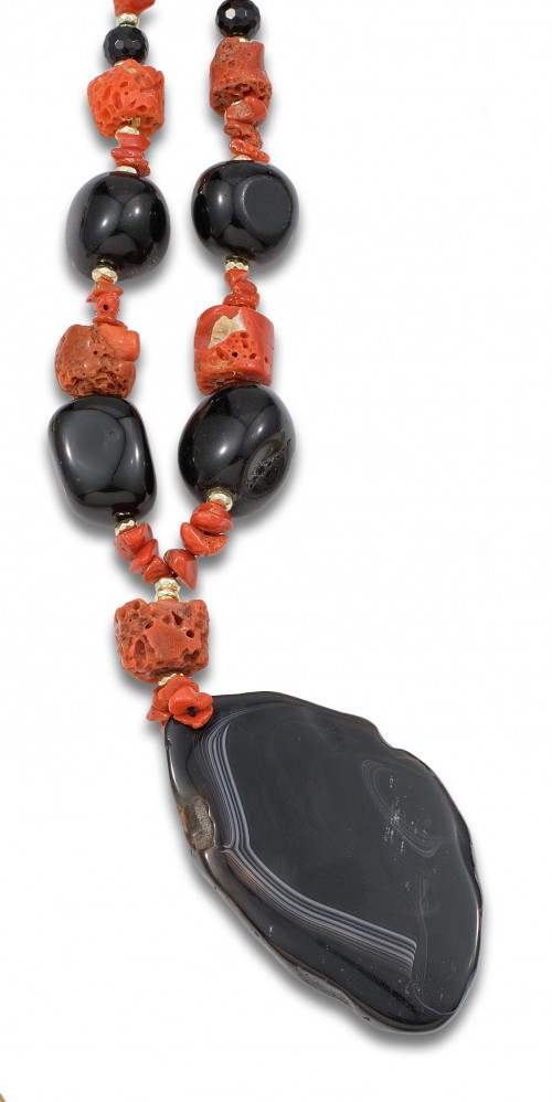 Sautoir de cuentas de coral barroco, cuentas de ónix y centro de ágata negra.