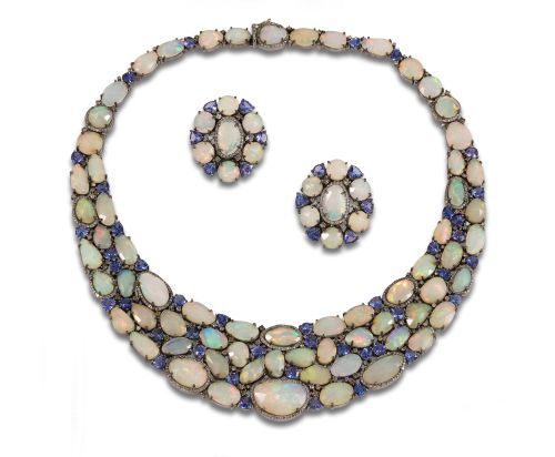 SET DE COLLAR Y PENDIENTES DE DIAMANTES, ÓPALOS Y TANZANITA