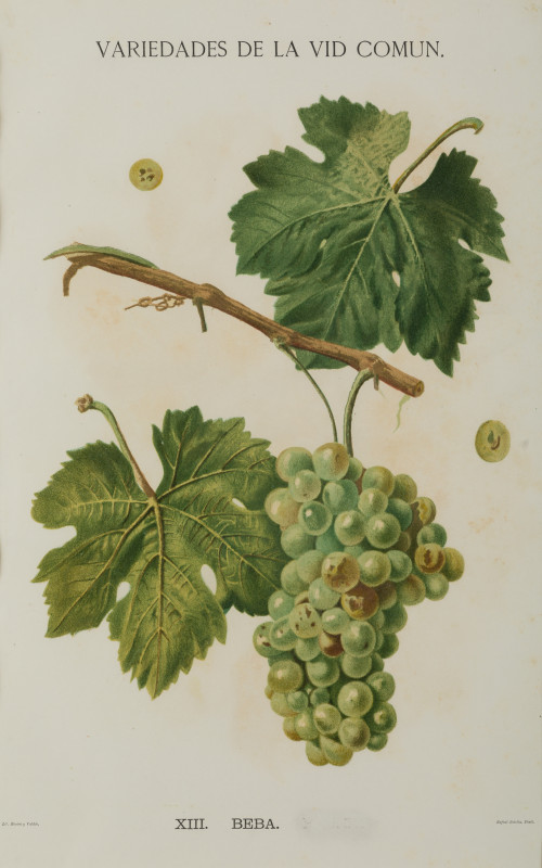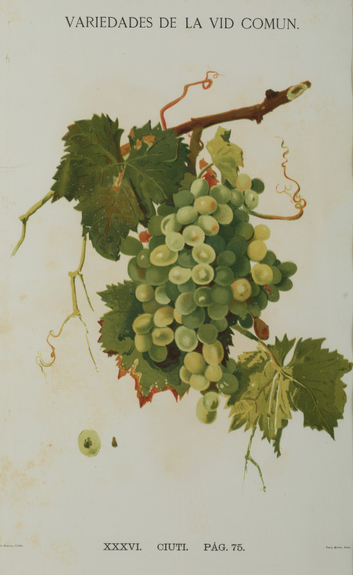 Dos variedades de uva pintadas del natural y litografiadas en color para la edición ilustrada de la obra de Clemente y Rubio: “Variedades de la Vid”, con motivo de la Primera Exposición Vinícola Nacional en 1877.
