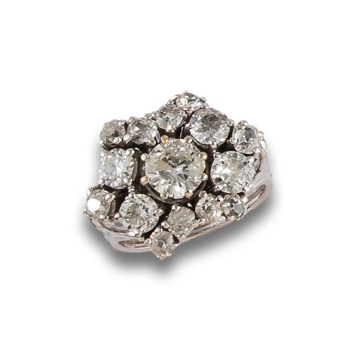 Sortija años 50 de oro blanco de 18K en un diseño con forma de estrella y diamantes talla antigua y un peso total aproximado de 2.80 ct. (diamante central con filetín lascado). Peso: 8.8 g.