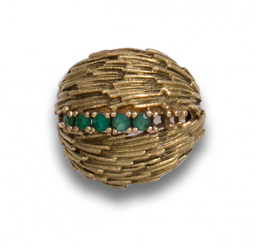 Sortija bombé, años 70, de oro amarillo de 18 kt. Formada por diseño vegetal con centro de hilera de esmeraldas, talla redonda (falta una), engastadas en garras. Peso: 8,9 Gr..