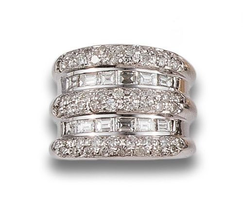 Sortija bombé de oro blanco de 18 kt. Formada por hileras de diamantes, talla brillante y baguette, peso total estimado de 2.10 ct.