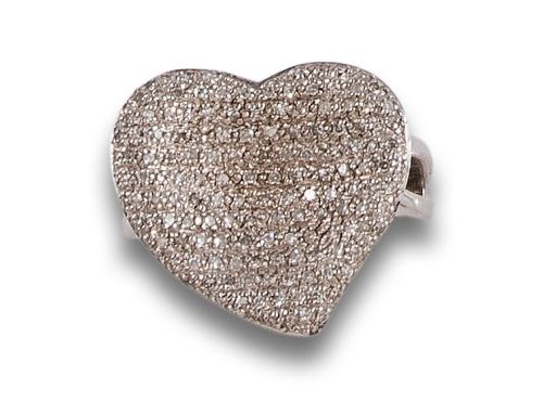 Sortija corazón de oro blanco de 18 kt. Cuajada de diamantes, talla simple, engastados en grano. Brazos dobles calados. Peso: 9,80 Gr..