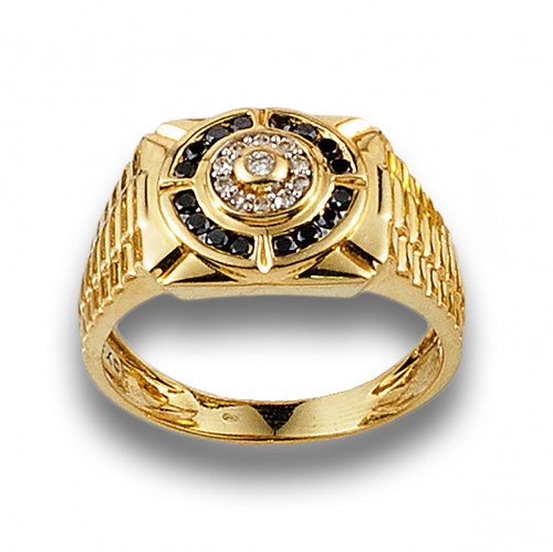 Ancha sortija de caballero de oro amarillo gallonado de 18 kt. Formada por un diseño circular central de diamantes incoloros, talla brillante, engastados en chatón y grano y orla de diamantes negros, talla brillante, engastados en carril. Talla 21.