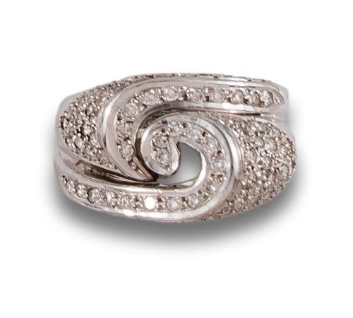 Sortija de oro blanco de 18 kt. Formada por diseño calado de diamantes, talla brillante, engastados en grano. Peso: 9,40 Gr..