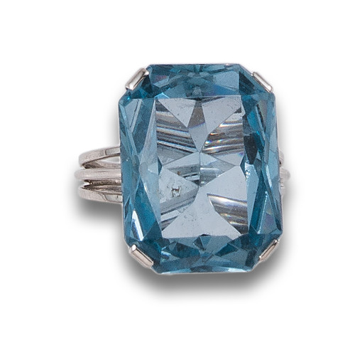 Sortija de oro blano de 18 kt. Formada por una espinela sintética, talla rectangular engastada en garras.