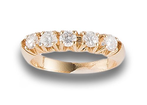 Sortija tipo cinquillo en oro amarillo de 18 kt. con diamantes, talla brillante, con un peso total estimado de 0.75 ct.