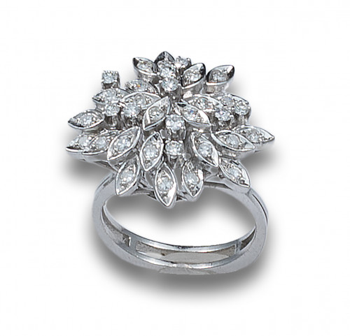 Sortija flor de oro blanco de 18 kt. formada por hojas cuajadas de diamantes, talla brillante y simple. Engaste en garras y en grano.