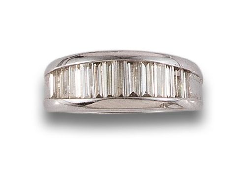 Sortija media alianza de oro blanco de 18 kt. Formada por diamantes en degradé, talla baguette. engastados en carril.